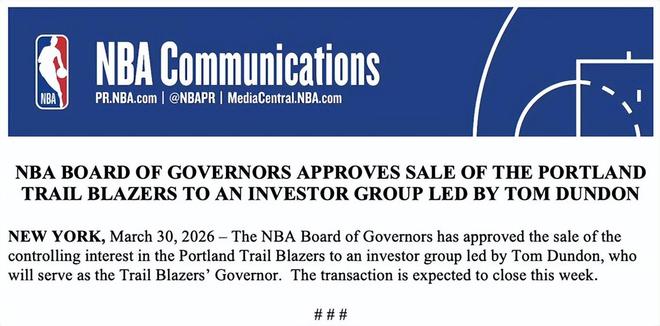 北京时间3月31日,NBA官方发布公告,联盟董事会已批准将波特兰开拓者队的控股权出售给由汤姆-邓登领导的投资集团,邓登将担任开拓者队的董事。该交易预计于本周完成。这也意味着杨瀚森要正式换老板了。