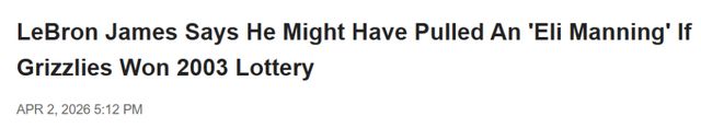 北京时间4月3日,勒布朗-詹姆斯表示,如果孟菲斯灰熊在2003年NBA选秀抽签中抽中状元签,他可能会拒绝为灰熊效力,并将这种潜在的罢签行为比作伊莱-曼宁在2004年NFL选秀中拒绝为圣地亚哥闪电队出战的做法。