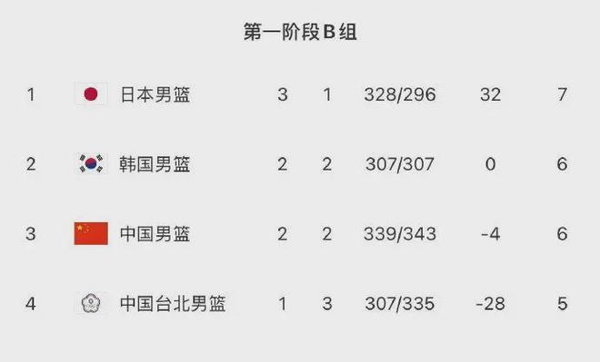 目前中国男篮2胜2负位列B组第三,落后日本男篮和韩国男篮,领先中国台北队。