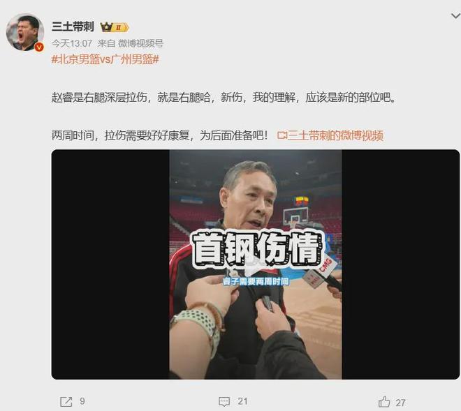 前两天北京队客场66-81不敌浙江队赛前,30岁的赵睿热身时意外腿部拉伤,说是新伤即右腿深层拉伤,相关消息源透露得休养两周时间。