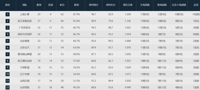 拥有全联盟最豪华阵容的北京队迄今为止以21胜12负排名联盟第六,落后上海队(29-4)、广厦队(27-6)、广东队(22-11)、深圳队(22-11)和山东队(22-11)。