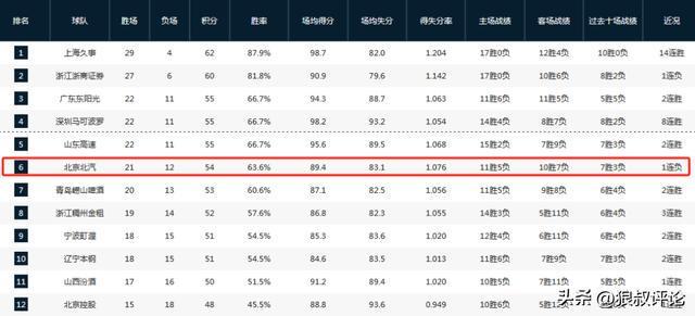 但截止目前,北京战绩只有21胜12负,排在积分榜第六位,以新赛季初就喊出争冠的层面,肯定是未能达到预期。