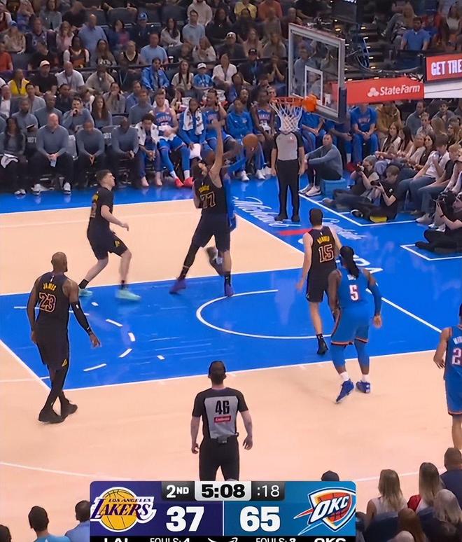 比赛甫一开始,湖人便在攻守两端全面失序,首节便落后23分;进入第三节后,分差骤然飙升至45分,比赛早早失去悬念。全队始终未能找回节奏,球员动作迟滞、配合生硬,整场如同被雷霆牢牢压制于半场之内,毫无反击余地。