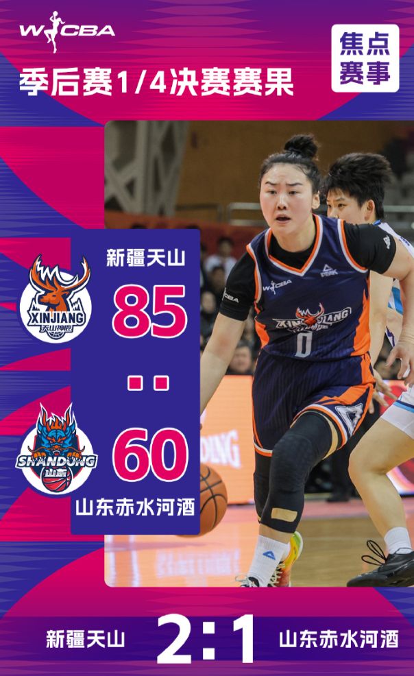WCBA季后赛1/4决赛第三轮,新疆女篮85-60击败山东女篮晋级四强,这场比赛的第二节新疆队净胜10分后开始掌控局势,第三节新疆队一波25-11直接打崩山东队,最终新疆队以大比分2-1挺进四强。