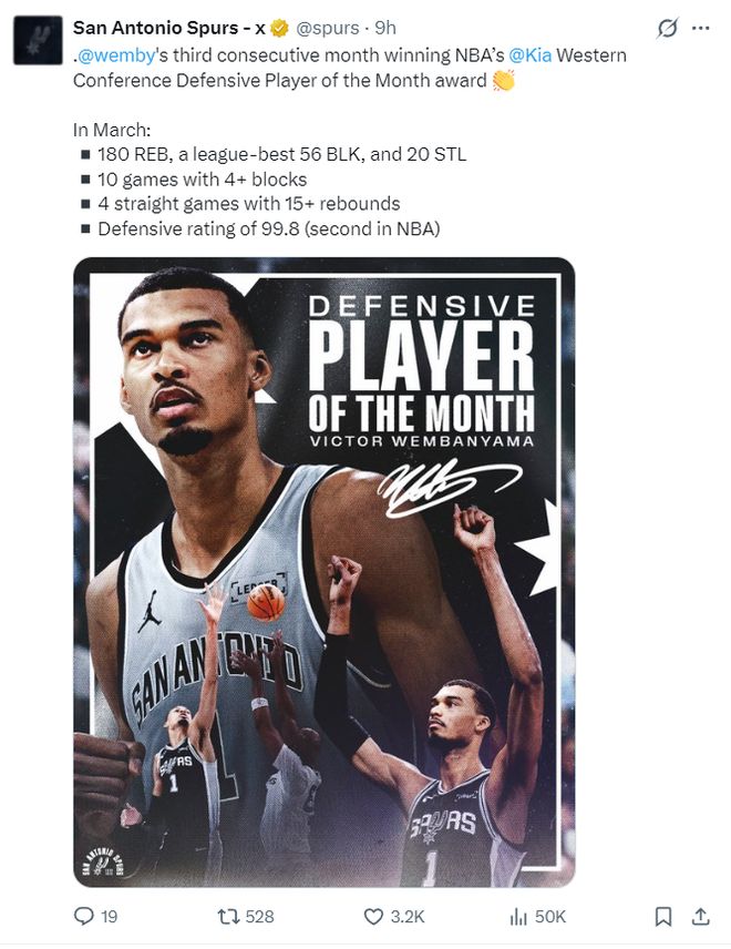 这场比赛之前NBA官方公布了约最佳防守球员,文班亚马180篮板56盖帽20抢断,有10场比赛至少4封盖,连续4场比赛篮板15+,防守效率99.8联盟第二。但这场对阵快船的比赛文班亚马不会登场。(本赛季61场比赛还差4场评奖)