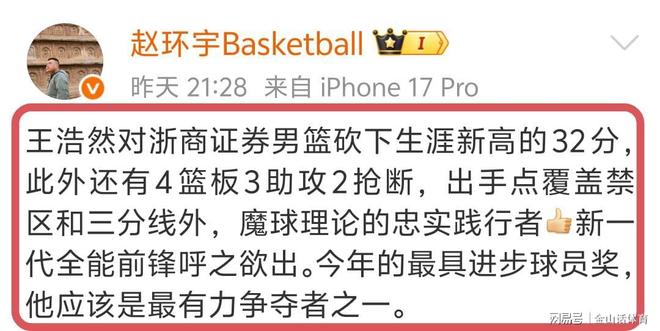 赛后,媒体人赵环宇社交平台发文,对王浩然的表现赞不绝口:对浙商证券男篮砍下生涯新高的32分,此外还有4篮板3助攻2抢断,出手点覆盖禁区和三分线外,魔球理论的忠实践行者,新一代全能前锋呼之欲出。今年的最具进步球员奖,他应该是最有力争夺者之一。