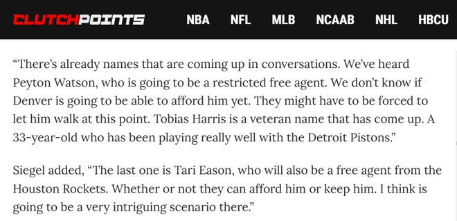 “已经有一些名字进入讨论范围。我们听到了佩顿-沃特森,他将成为受限制自由球员。目前还不清楚掘金是否有薪资空间留下他,现阶段他们可能不得不放他离开。还有一位老将托拜厄斯-哈里斯也被提及,这位33岁的球员本赛季在底特律活塞表现十分出色。”
