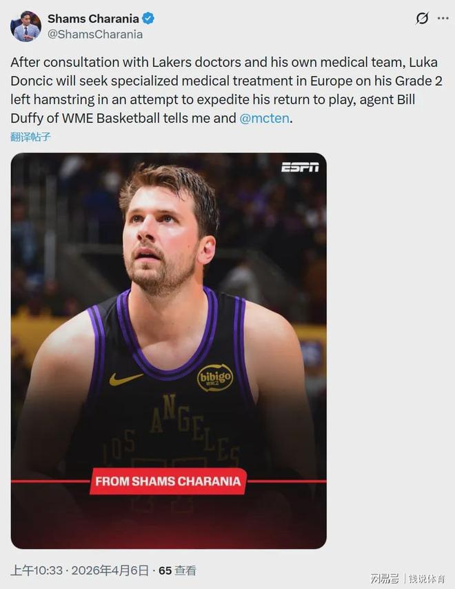 北京时间4月6日,NBA常规赛激战正酣,湖人球星东契奇的伤病进展牵动联盟目光。据NBA名记Shams最新报道,东契奇将启程前往欧洲,接受左腿筋二级拉伤的专项医疗治疗,全力加速康复进程,争取早日重返赛场。