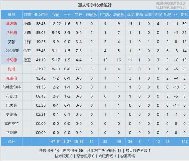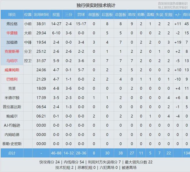弗拉格把拉拉维亚打到6犯离场,最后1分钟独行侠依然领先9分。全场结束,独行侠134-128战胜湖人,独行侠结束主场14连败。弗拉格45分8板9助2断、华盛顿15分5板;詹姆斯30分9板15助、海斯23分4板、肯纳德15分16板11助。