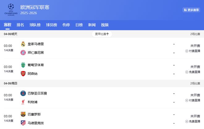 北京时间2026年4月8日至9日凌晨,2025-2026赛季欧洲冠军联赛1/4决赛首回合将全面打响。