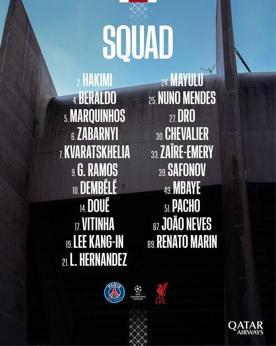前锋:7-克瓦拉茨赫利亚、9-贡萨洛-拉莫斯、10-登贝莱、14-杜埃、27-德罗-费尔南德斯、49-姆巴耶