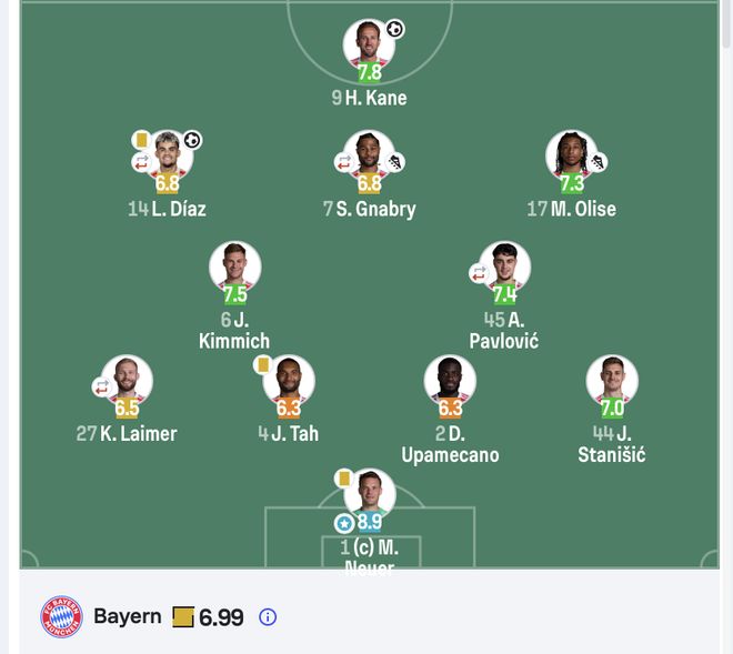 门将方面,诺伊尔全场完成5次扑救,评分7.67;卢宁同样贡献5次扑救,但无力阻止两个丢球。